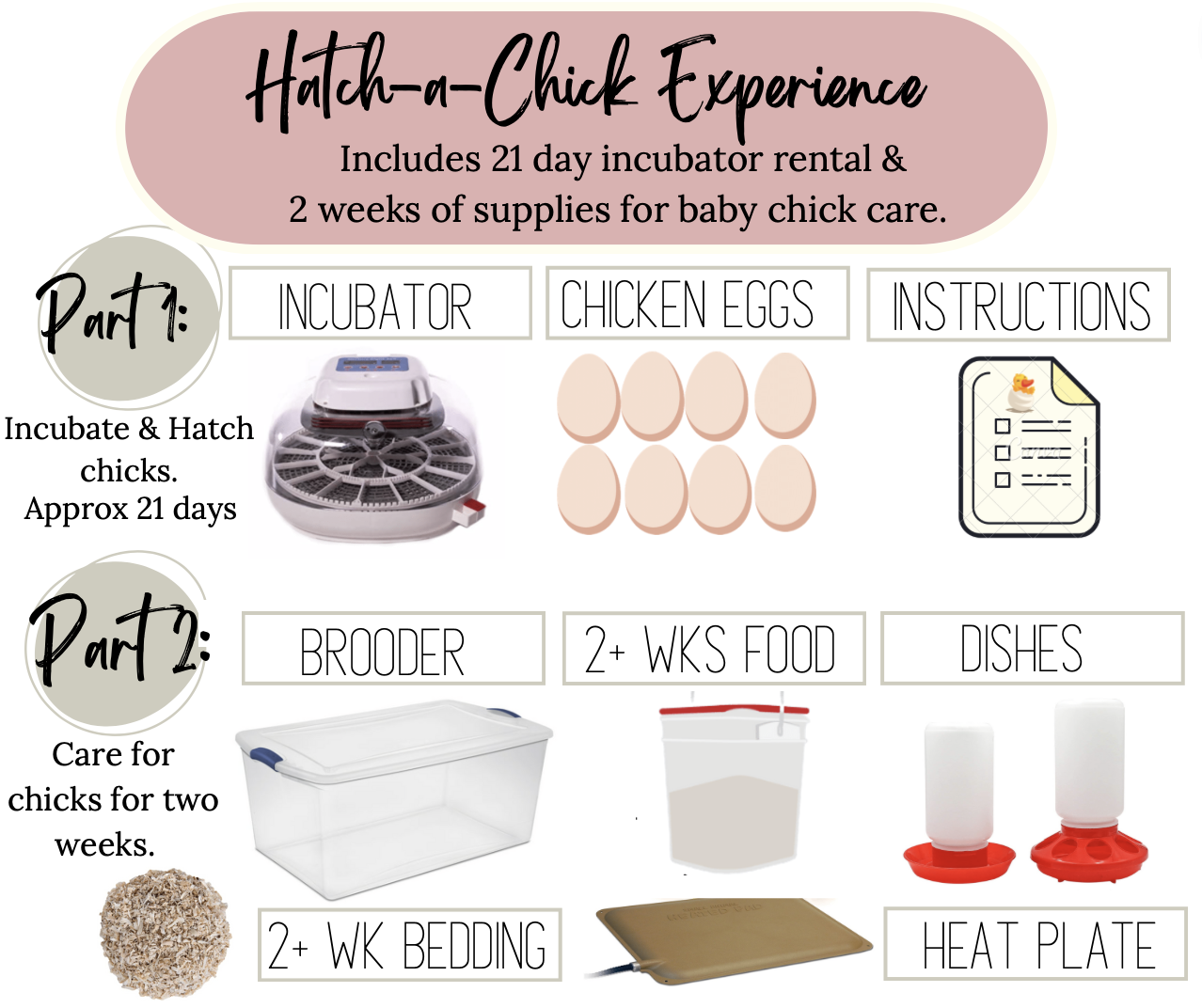Our hatch-a-chick experience makes it easy for families to incubate, hatch and care for baby chicks. To incubate the chicken eggs, all that is required from you is little water added daily! The incubator does the rest! Our hatching kits are specially curated to ensure you have all the supplies and support needed to be successful. Once chicks are returned to the farm they live out their lives in open pastures to lay eggs for our community or protect flocks on farms!