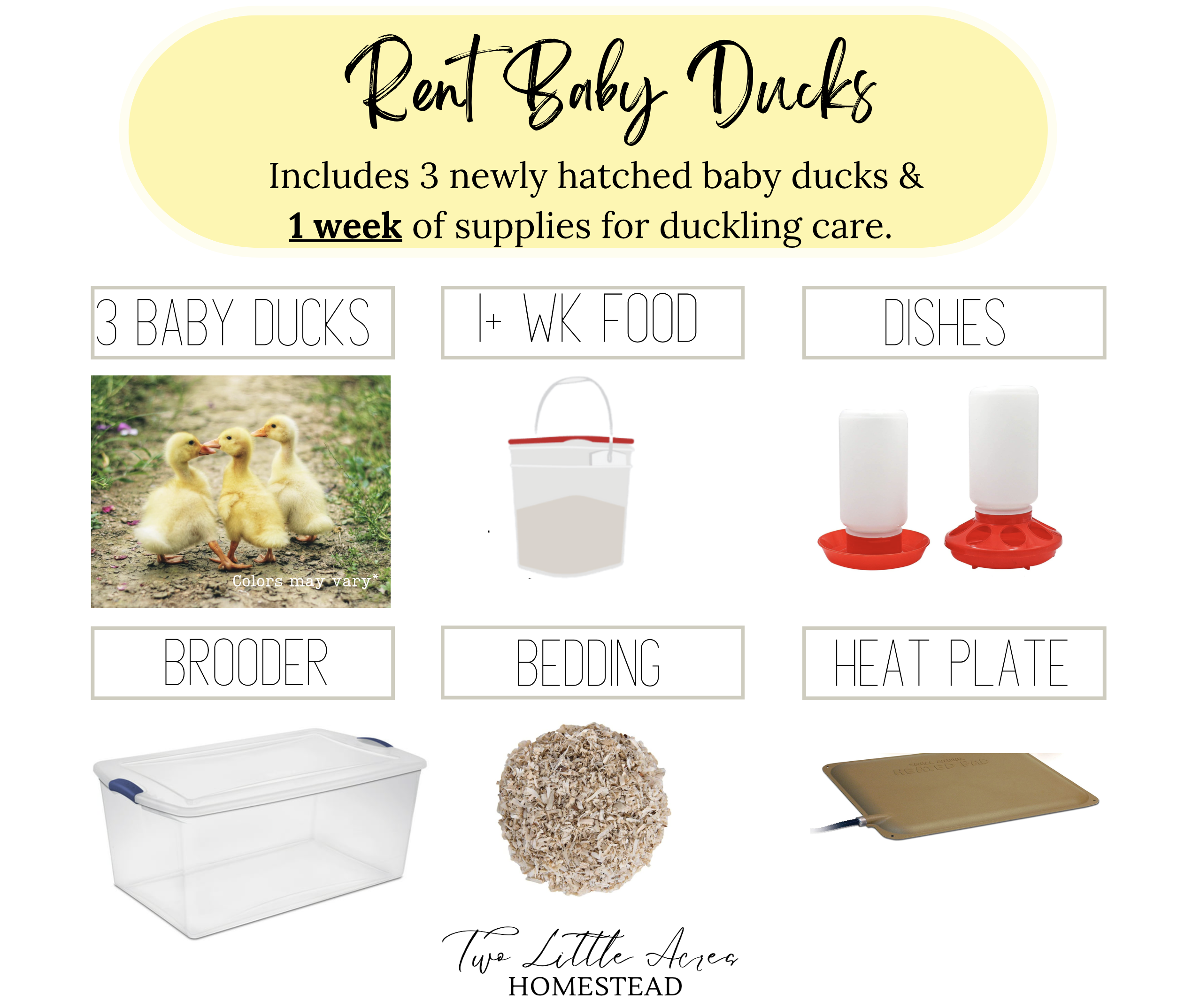 The baby duck learning experience makes it easy for families to care for 3 newly hatched baby ducklings. Our experience is specially crafted to ensure you have all the supplies and support needed to provide a memorable and successful learning experience. Once ducklings are returned to the farm they live out their lives in open pastures to lay eggs for our community or protect flocks on farms!